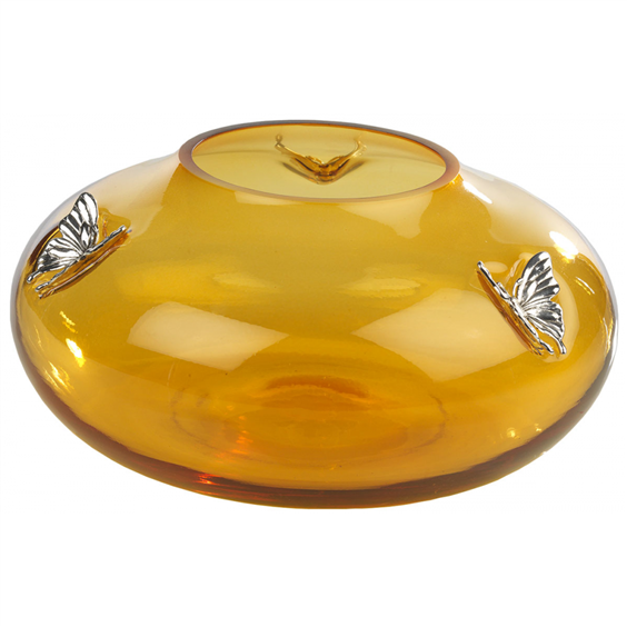 ARGENESI CENTROTAVOLA IN VETRO SOFFIATO CON FARFALLE IN ARGENTO colore Giallo Ambra trasparente diametro 30 cm h 11.5 Le creazioni Argenesi sono realizzate artigianalmente a Padova, Italia. Grazie all'esclusiva tecnologia SilvanSputteringAg è possibile rivestire qualsiasi tipo di superficie con argento puro 999. Gli oggetti Argenesi sono durevoli nel tempo e grazie a uno speciale trattamento non si opacizzano e non necessitano di puliture con prodotti specifici.