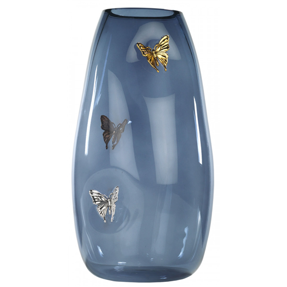 ARGENESI VASO IN VETRO SOFFIATO CON FARFALLE IN ARGENTO 925 colore Blu trasparente h cm 42 Le creazioni Argenesi sono realizzate artigianalmente a Padova, Italia. Grazie all'esclusiva tecnologia SilvanSputteringAg è possibile rivestire qualsiasi tipo di superficie con argento puro 999. Gli oggetti Argenesi sono durevoli nel tempo e grazie a uno speciale trattamento non si opacizzano e non necessitano di puliture con prodotti specifici.