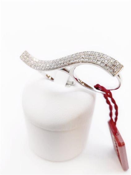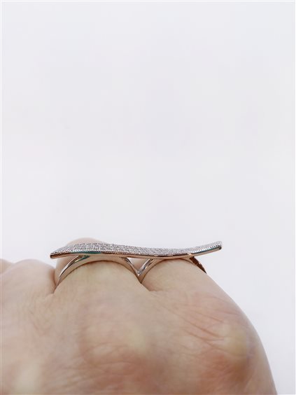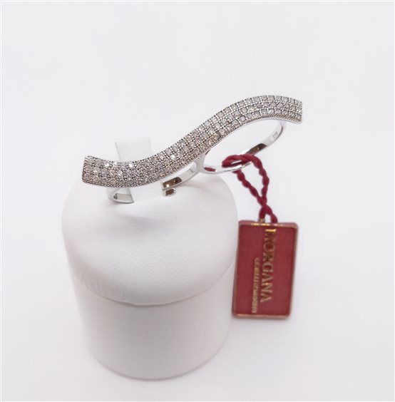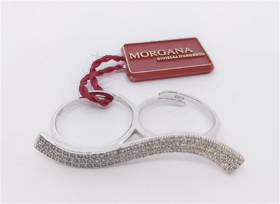 MORGANA GIOIELLI IN ARGENTO Anello doppio in argento 925 rodiato da indossare su due dita con barra curva in pavè di cristalli bianchi. Gambi aperti regolabili di due misure circa in più o in meno. Misura centrale 15.