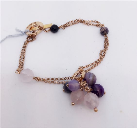 TU!DONNA Bracciale in argento 925 placcato oro orsa 24 kt. Base maglia rolò diamantata con ciuffo centrale in boules sfaccettate di quarzo rosa, viola rutilato e piccola boule in agata nera. Gioiello anallergico, nichel free.