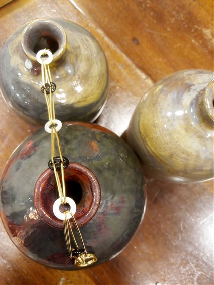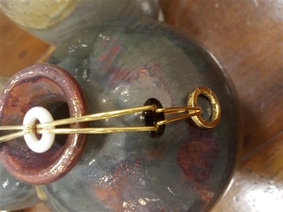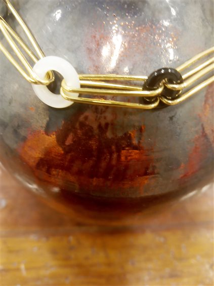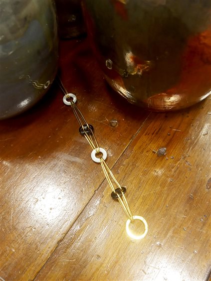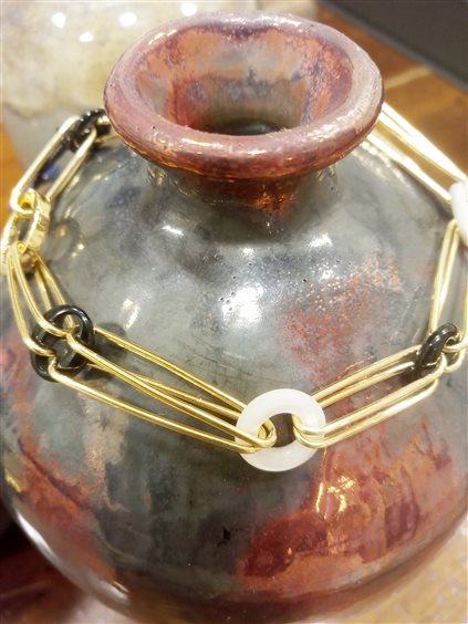RZ UNICOLOR PEZZI UNICI A PREZZI UNICI (ultimi pezzi di collezioni esaurite) Bracciale in oro giallo 24 carati con maglie geometriche rigide inserite in 4 elementi in onice (taglio maglia marinara due fori, lunghezza 1 cm ca) e 3 in madreperla (cerchietto 1 foro, diametro 1 cm ca). Chiusura con raffinato e massiccio cerchio con scattino a scomparsa. Fine lavorazione orafa artigianale.