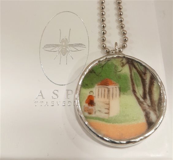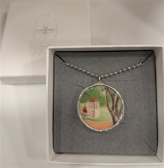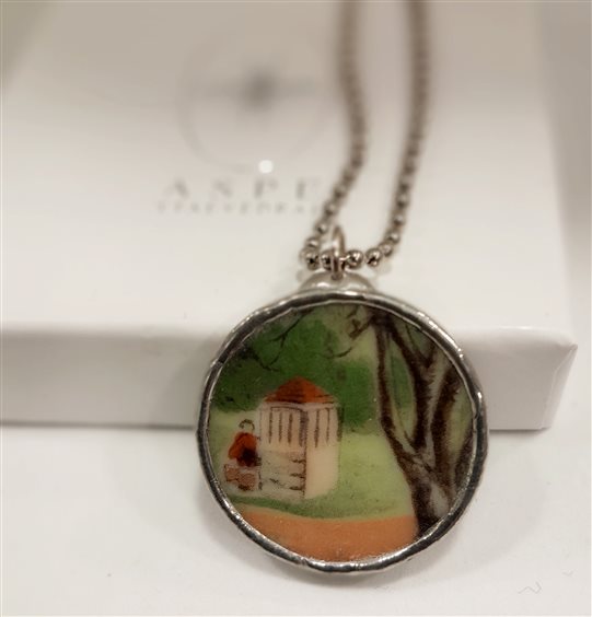 Collana Erounpiatto Aspetta e Vedrai Tondo Japan maglia pallina diamantata 75 cm, chiusura con bottoncino a pressione, diametro 2,5 cm Gioiello creato a mano in Italia a partire da frammenti di piatti rotti vintage e di pregio. La montatura metallica è realizzata con tecnica Tiffany, in lega metallica anallergica di stagno e argento. Ogni pezzo è unico.