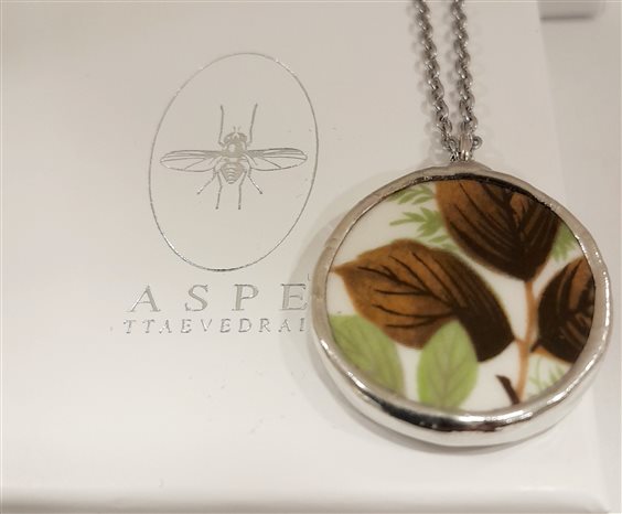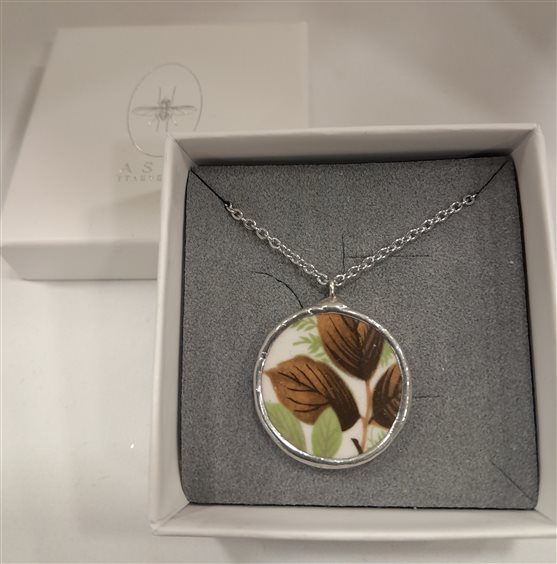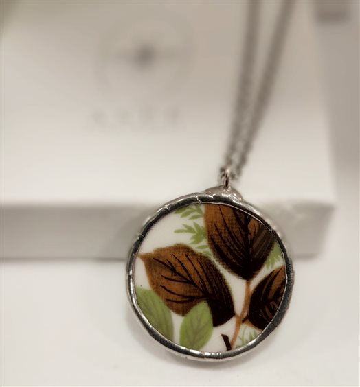Collana Erounpiatto Aspetta e Vedrai Tondo Foglie maglia pallina diamantata 75 cm, chiusura con bottoncino a pressione, diametro 2,5 cm Gioiello creato a mano in Italia a partire da frammenti di piatti rotti vintage e di pregio. La montatura metallica è realizzata con tecnica Tiffany, in lega metallica anallergica di stagno e argento. Ogni pezzo è unico.
