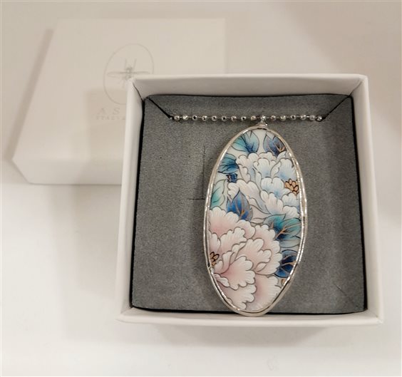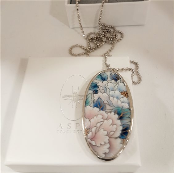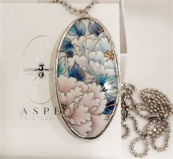 Collana Erounpiatto Aspetta e Vedrai Ovale fiori Rosa Azzurro maglia pallina diamantata 75 cm, chiusura con bottoncino a pressione, misura pendente ovale 5x2,5 cm Gioiello creato a mano in Italia a partire da frammenti di piatti rotti vintage e di pregio. La montatura metallica è realizzata con tecnica Tiffany, in lega metallica anallergica di stagno e argento. Ogni pezzo è unico.