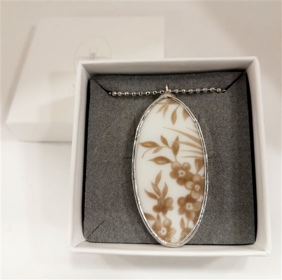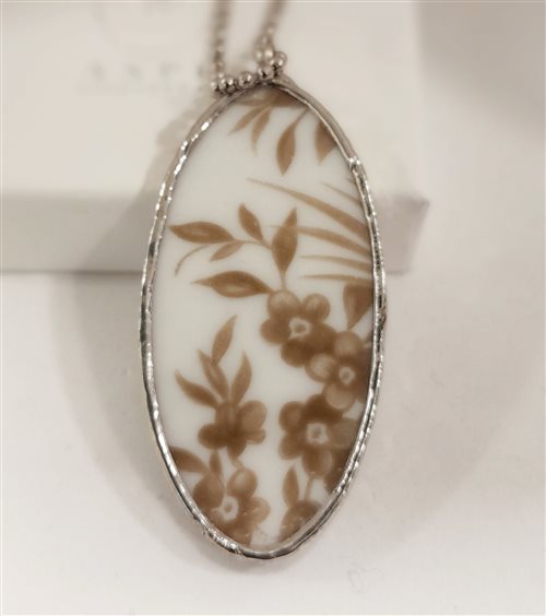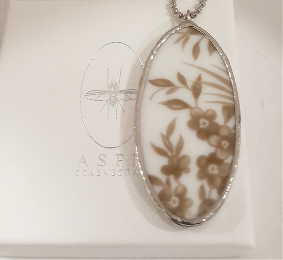 Collana Erounpiatto Aspetta e Vedrai Fiori Nature maglia pallina diamantata 75 cm, chiusura con bottoncino a pressione, pendente ovale 5x2,5 cm Gioiello creato a mano in Italia a partire da frammenti di piatti rotti vintage e di pregio. La montatura metallica è realizzata con tecnica Tiffany, in lega metallica anallergica di stagno e argento. Ogni pezzo è unico.