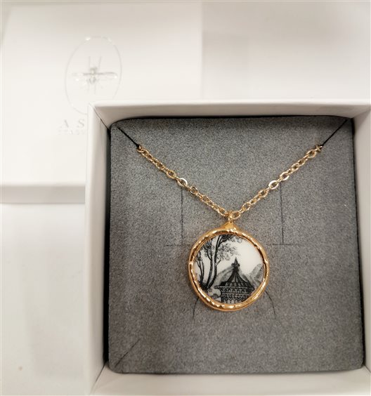 Girocollo Erounpiatto Aspetta e Vedrai Tondo mini paesaggio bianco e nero 40cm + 5 prolunga, chiusura con moschettone, diametro 17 mm Gioiello creato a mano in Italia a partire da frammenti di piatti rotti vintage e di pregio. La montatura metallica è realizzata con tecnica Tiffany, in lega metallica anallergica di stagno e argento. Ogni pezzo è unico.