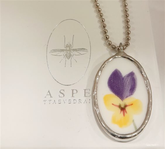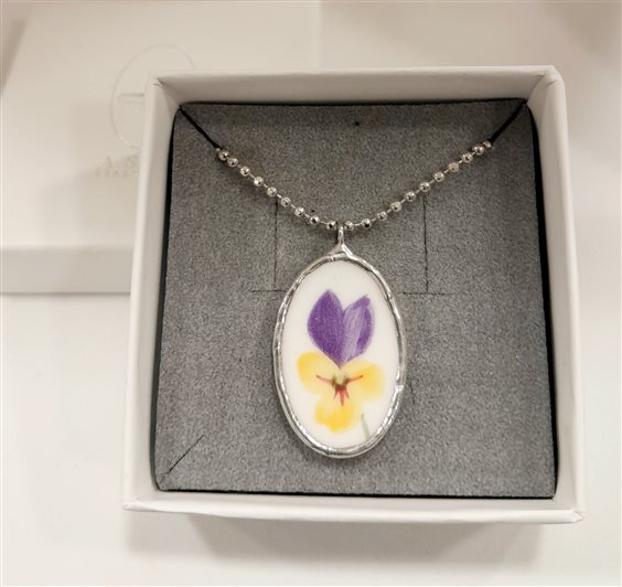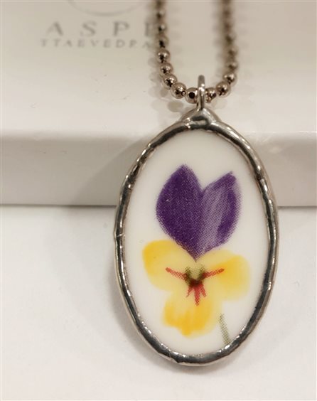 Girocollo Erounpiatto Aspetta e Vedrai Ovale violetta 40cm + 5 prolunga, chiusura con moschettone, pendente ovale cm 3,3x1,6 Gioiello creato a mano in Italia a partire da frammenti di piatti rotti vintage e di pregio. La montatura metallica è realizzata con tecnica Tiffany, in lega metallica anallergica di stagno e argento. Ogni pezzo è unico.