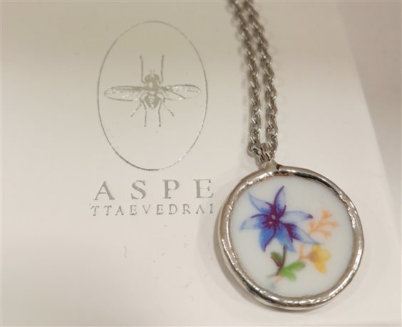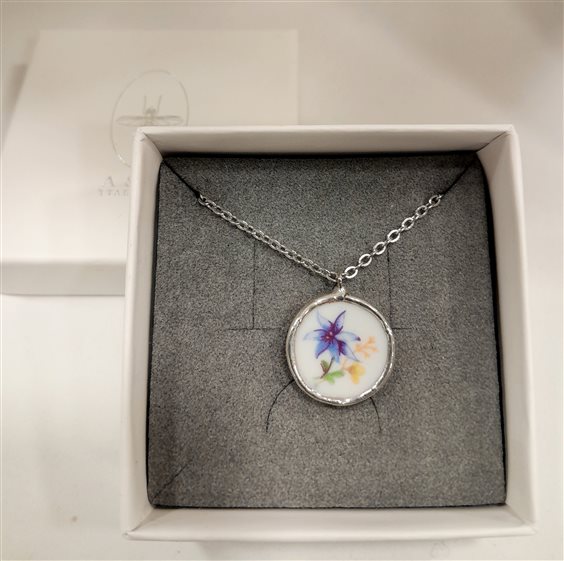 Girocollo Erounpiatto Aspetta e Vedrai Tondo mini fiore blu 40cm + 5 prolunga, chiusura con moschettone, diametro 17mm Gioiello creato a mano in Italia a partire da frammenti di piatti rotti vintage e di pregio. La montatura metallica è realizzata con tecnica Tiffany, in lega metallica anallergica di stagno e argento. Ogni pezzo è unico.