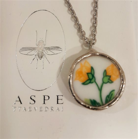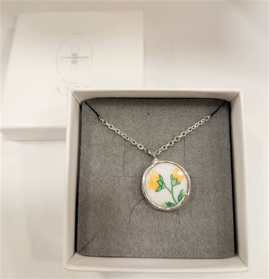 Girocollo Erounpiatto Aspetta e Vedrai Tondo mini fiore giallo 40cm + 5 prolunga, chiusura con moschettone, diametro 17 mm Gioiello creato a mano in Italia a partire da frammenti di piatti rotti vintage e di pregio. La montatura metallica è realizzata con tecnica Tiffany, in lega metallica anallergica di stagno e argento. Ogni pezzo è unico.