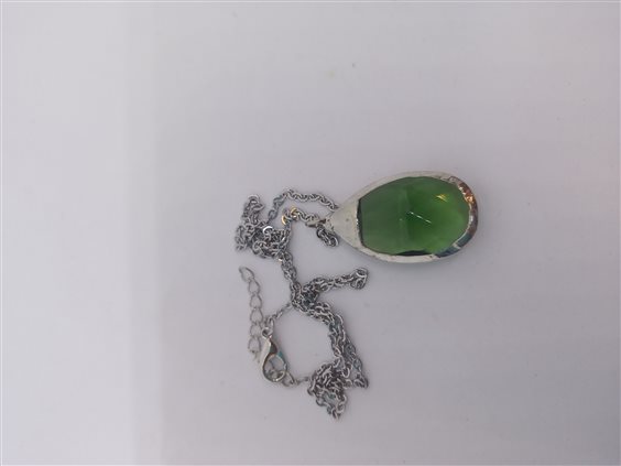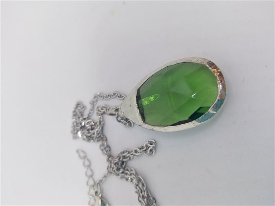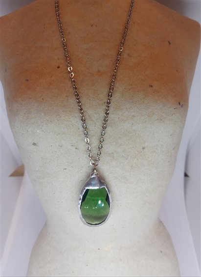 ASPE Aspettaevedrai Collezione Memorie Gocce di lampadario vintage piccola Gioiello realizzato a mano in Italia a partire da materiali vintage di recupero e naturali. La montatura metallica è realizzata con tecnica Tiffany, in lega metallica anallergica di stagno e argento. Ogni pezzo è unico o prodotto in numero limitatissimo di esemplari in Emilia Romagna nel laboratorio di Aspettaevedrai. Catena a palline diamantate dorate con chiusura a incastro. Il pendente è una goccia di lampadario vintage verde