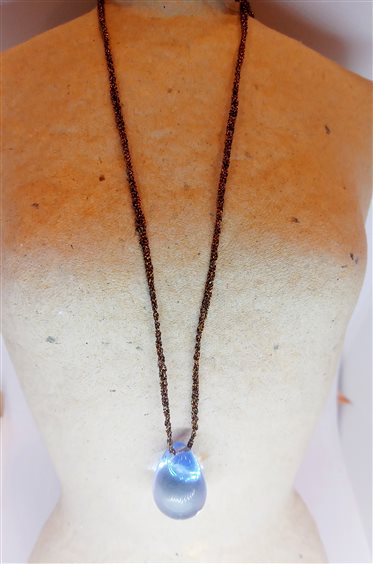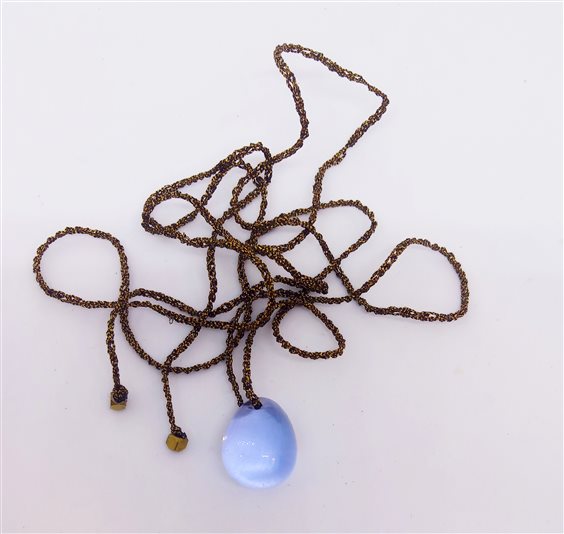 MB GIOIELLI FIRENZE Gioielli artigianali disegnati e realizzati interamente a mano da Marcella Bardi Collana gocce Murano azzurro cielo Collana lunga in filo di seta giapponese kimono intrecciato con goccia di lampadario antico in vetro soffiato di Murano color azzurro cielo, finali cubetti in ematite dorata. Chiusura a nodo.