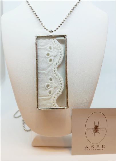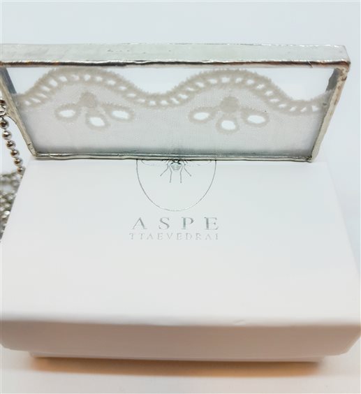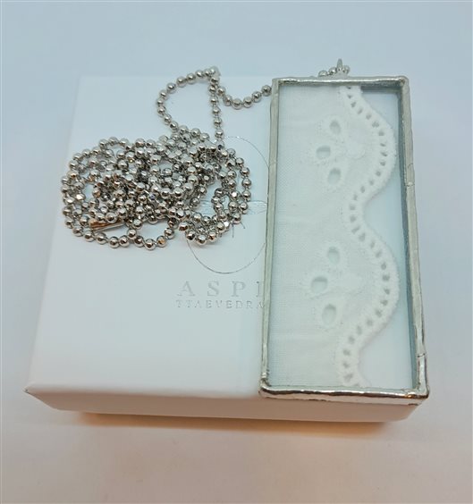 Aspetta e Vedrai Collezione Memorie Collana con pizzo antico montata con tecnica Tiffany in lega metallica anallergica di argento e stagno. Misura pendente 6x2,5 cm, spessore 0,5 cm. Catena maglia pallina diamantata con chiusura a incastro, indossabile anche senza aprire. Ogni pezzo è unico e realizzato artigianalmente in Emilia Romagna-Italy