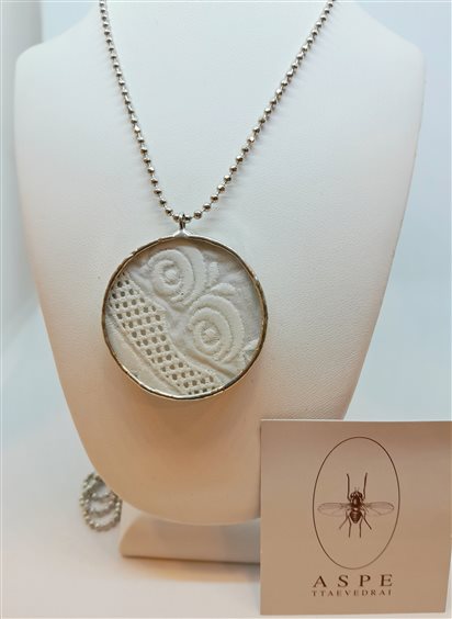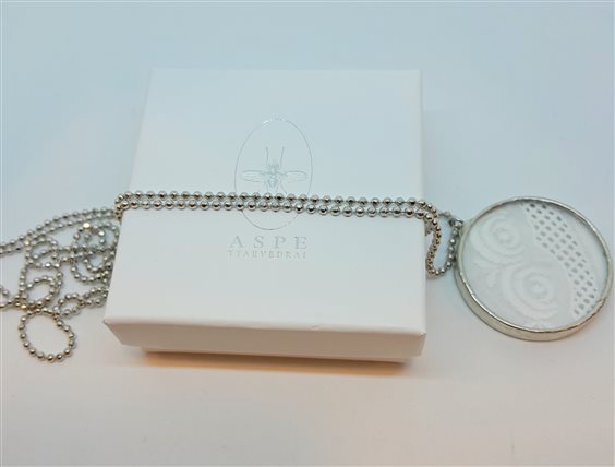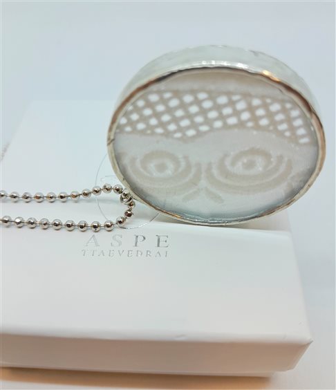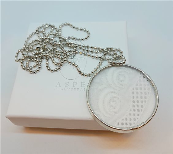 Aspetta e Vedrai Collezione Memorie Collana con pizzo antico montata con tecnica Tiffany in lega metallica anallergica di argento e stagno. Diametro pendente 3,5 cm, spessore 0,5 cm. Catena maglia pallina diamantata con chiusura a incastro, indossabile anche senza aprire. Ogni pezzo è unico e realizzato artigianalmente in Emilia Romagna-Italy