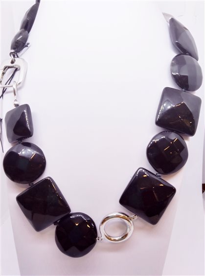 Collana in pietre dure e argento. Girocollo con pastiglie sfaccettate in onice 2.5 cm. Elementi in argento rodiato e chiusura con grande moschettone quadrato.