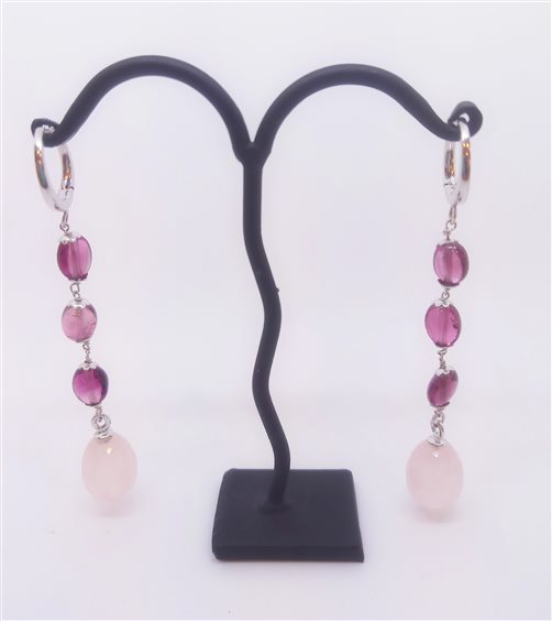 RZ UNICOLOR PEZZI UNICI A PREZZI UNICI (ultimi pezzi di collezioni esaurite) Orecchini in oro bianco rodiato 24 carati con tre ovali asimmetrici in spinello color ciliegia pallido taglio cabochon (0.4cm ca) incatenati a goccia sfaccettata in quarzo rosa pallido (1.3 cm). Chiusura a scattino. Raffinata lavorazione orafa artigianale.