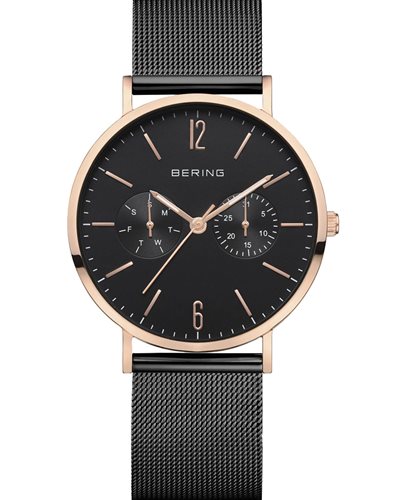 Cassa in acciaio inox laminato oro rosa, quadrante nero con due contatori day-date, diametro mm.36, vetro zaffiro, impermeabilità 3 atm, garanzia 3 anni.