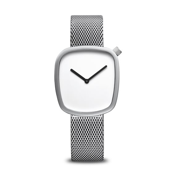 BERING PEBBLE 18034-004 designed by KIBISI L'orologio, creato da uno dei più influenti gruppi di designers scandinavi, è ispirato alla forma smussata dei ciottoli che si trovano lungo le spiagge della costa scandinava. Design minimalista, moderno ed elegante abbinato alla qualità Bering: acciaio inossidabile spazzolato, vetro zaffiro antigraffio. bracciale in maglia Milano coordinato con la cassa. Collection: Classic Category: watch Gender: female Glass type: flat sapphire crystal Movement type: quartz Case color: brushed silver Case height: 6 mm Case width: 34 mm Case material: stainless steel Strap material: milanese Strap color: silver Strap width: 16 mm Clasp: safety clasp Dial color: white Water proofness: 3 ATM