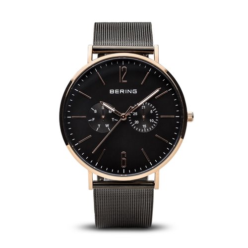Ispirata al design danese, la COLLEZIONE CLASSIC presenta un orologio unico, creato per dare un tocco di stile al look quotidiano. La cassa in acciaio inox 316L laminato oro rosa, insieme al moderno cinturino in maglia Milano nero, realizzano il classico look BERING. Gli indicatori multifunzione integrati (giorno/data) e gli indici in color oro rosa completano il quadrante alla moda. Il vetro zaffiro cristallino, antigraffio e particolarmente resistente garantisce la visione chiara del quadrante. Garanzia 5 anni.