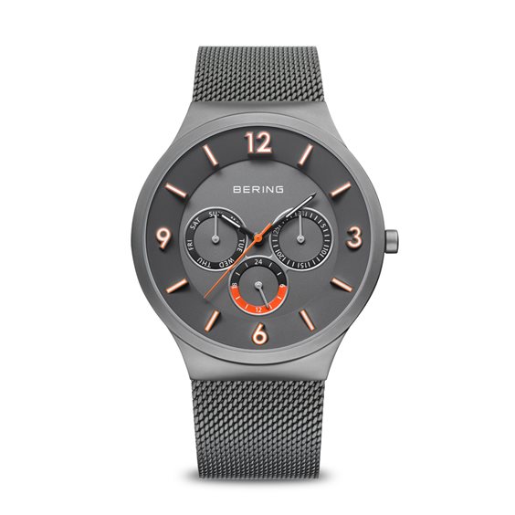Cassa in acciaio satinato mm.41, vetro zaffiro, movimento al quarzo con tre contatori, bracciale maglia Milano con fibbia butterfly regolabile, impermeabilità 3 atm., garanzia 3 anni.