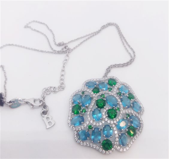 BOCCADAMO ARGENTO Collana in argento a fiore con cristalli Swarovski colorati nei toni dell'azzurro e del verde scuro e zirconi bianchi. Misura della collana 40 cm estendibile a 45. Chiusura con moschettone.