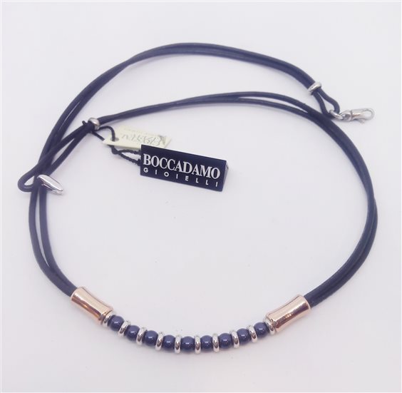 BOCCADAMO MAN Collana girocollo con doppio cordino in cuoio e chiusura con moschettone. Elemento centrale in argento bianco e rosé alternato a boules blu intenso di cristalli Swarovski.