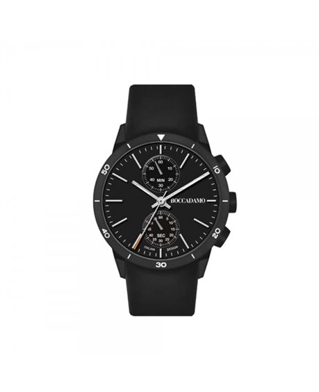 CRONOGRAFO DA UOMO BOCCADAMO TIME NAVY NV006 Cassa in acciaio di colore nero opaco, 42.5 mm Corona e fondello a vite Quadrante nero Lancette e indici argentati Vetro minerale antigraffio Cinturino nero 22 mm in silicone Movimento al quarzo Miyota Citizen di lunga durata Resistente all'acqua 5 ATM Spedito con scatola e garanzia 24 mesi originale Boccadamo