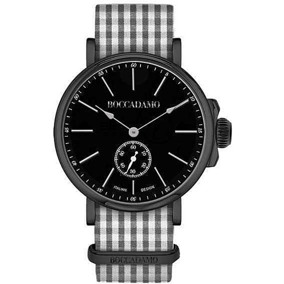 OROLOGIO DA UOMO BOCCADAMO TIME PRINCE PN008B Orologio solo tempo con quadrante circolare nero, indici e lancette bianchi Cassa in acciaio nera, 41 mm Cinturino sartoriale in cotone cucito a mano, fantasia Vichy grigio scuro, ansa 20 mm Vetro Minerale Movimento al quarzo Resistenza all'acqua 3 Atm Spedito con Scatola e garanzia originale Boccadamo Time