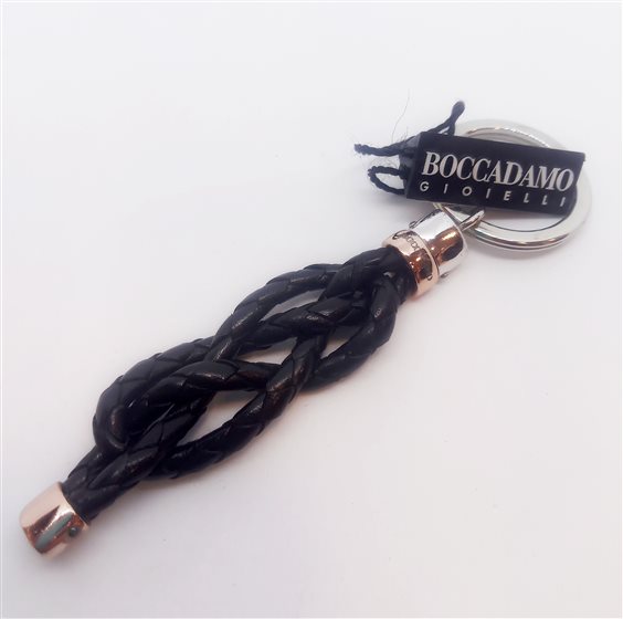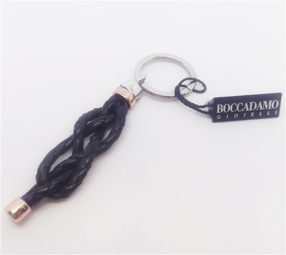 BOCCACAMO MAN Portachiavi in argento bianco e rosé e cuoio nero intrecciato e annodato, anello brisé in acciaio.