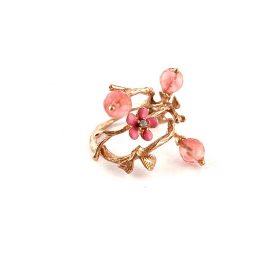 ELECICALE GIOIELLI Anello CIO CIO SAN, collezione ispirata a Maria Callas e allpopera Madama Butterfly. Anello in argento 925 in bagno oro rosa 18kt con fiori di ciliegio in smalto con zircone centrale e boules sfaccettate in quarzo cherry. I laboratori artigianali di Elecicale Gioielli nascono a Morro d'Alba, nel cuore delle Marche, dall'innata passione per i gioielli e le pietre dure che da sempre accompagnano la fondatrice dell'azienda Giulia Orsi, la quale, dopo diversi anni di formazione professionale nel settore, ha deciso di creare una propria linea di gioielleria artigianale in argento sterling 925, tutta made in Italy.