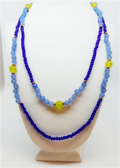 ELECICALE GIOIELLI Collana a due fili in quarzo blu avio e arancione con chiusura, prolunga 2 cm e elementi in argento 925 in bango oro rosa 24 kt. Lavorazione artigianale, design originale, made in Marche. Chiusura con moschettone.Gioiello anallergico, nichel free.