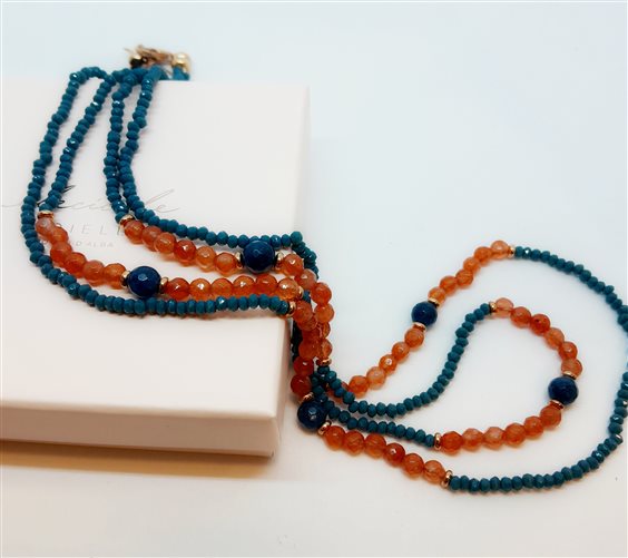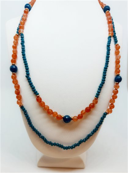 ELECICALE GIOIELLI Collana a due fili in quarzo verde e arancione con chiusura, prolunga 2 cm e elementi in argento 925 in bango oro rosa 24 kt. Lavorazione artigianale, design originale, made in Marche. Chiusura con moschettone.Gioiello anallergico, nichel free.