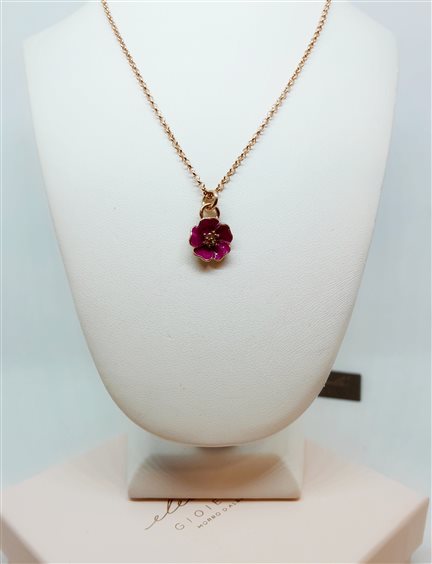 Elecicale gioielli Girocollo Il giardino di Emily, argento 925 in bagno oro rosa. Catena maglia rolò, pendente primula rosa con smalti. Design originale e lavorazione artigianale. Fatto a mano nelle Marche, Italia.