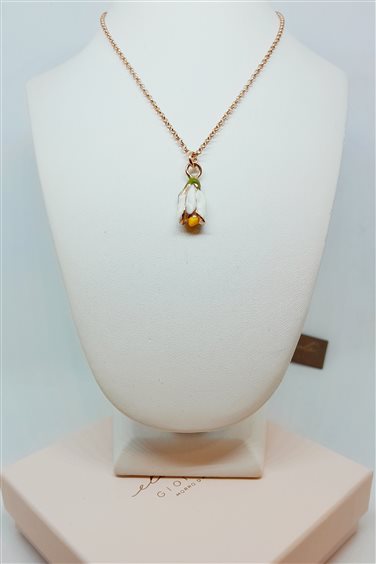 ELECICALE GIOIELLI Collezione Emily Dickinson ispirata al giardino della poetessa Collana con ciondolo in argento 925 con galvanica oro rosa 18kt, smalti. Lavorazione artigianale. Bucaneve: simbolo di purezza. Associato al passaggio dall'oscurità invernale alla serenità primaverile. Porta un messaggio di speranza poiché il fiore apparentemente delicato è l'unico ad affrontare le temperature fredde dell'inverno e a dischiudersi impavido. Ricevuto i regalo esprime tenacia e fiducia in se stessi.