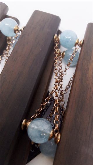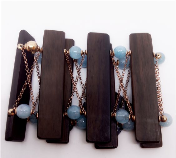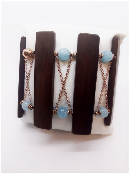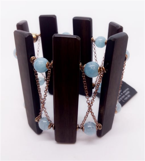 GIADAN GIOIELLI hand made in Italy Bracciale EBANY in argento 925 placcato oro rosa 24 kt, legno e acquamarina. Composto da sette elementi rettangolari in legno 6.9x1cm incatenati tramite maglia rolò diamantata con 13 sfere di acquamarina e una boule in argento rosato liscia. Montatura ad elastico. Gioiello nichel free, ipoallergenico.