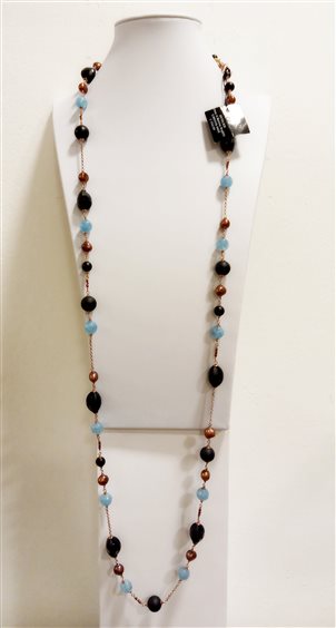 GIADAN GROUP Collana maglia rolò in argento 925 placcata oro rosé 18 kt con pietre naturali alternate: 16 boules sfaccettate di acqua marina diametro 10 mm, 6 boules in onice opaca diametro 8 mm, 5 boules in onice opaca diametro 12mm, 7 elementi a ogiva in onice opaca con motivo lucido, 14 perle barocche di acqua dolce brown. Chiusura con moschettone. Indossabile comodamente a uno o due giri, entro una certa misura indossabile anche a tre giri come choker.