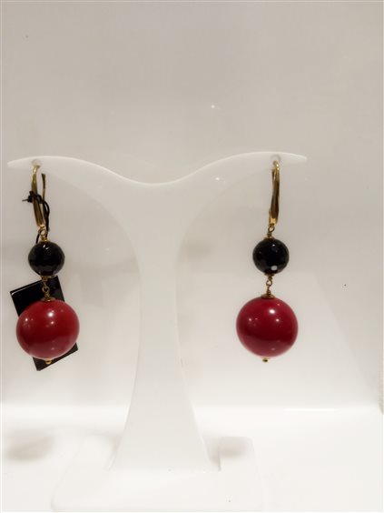 GIADAN GROUP GIOIELLI IN ARGENTO E PIETRE DURE orecchini pendenti ad amo della collezione Les BON BON in argento 925 placcato oro giallo 24 kt con quarzi naturali: boule sfaccettata in onice nero 10mm diametro e boule liscia in quarzo color rosso 18mm diametro