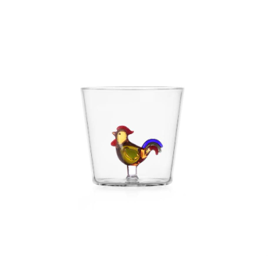 Animal Farm design Alessandra Baldereschi Tumbler gallo colore blu, rosso, giallo, clear vetro borosilicato fatto a mano e lavorato al lume lavabile in lavastoviglie a basse temperature