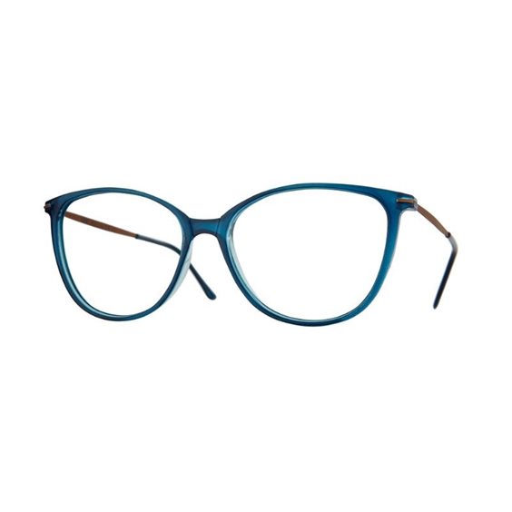 Montatura da donna in acetato sottile blu turchese, astine in titanio bronzo satinato senza viti.