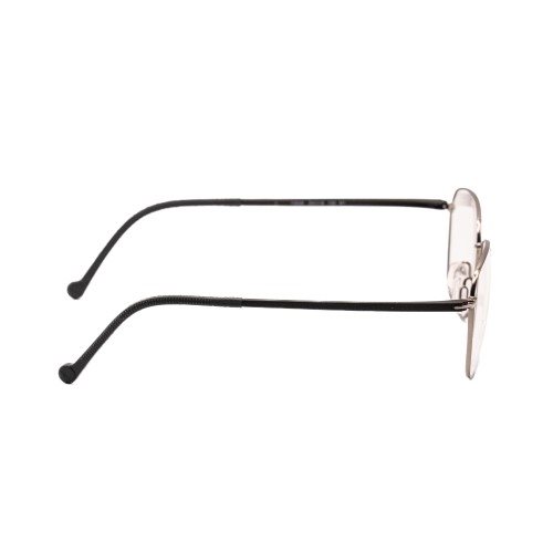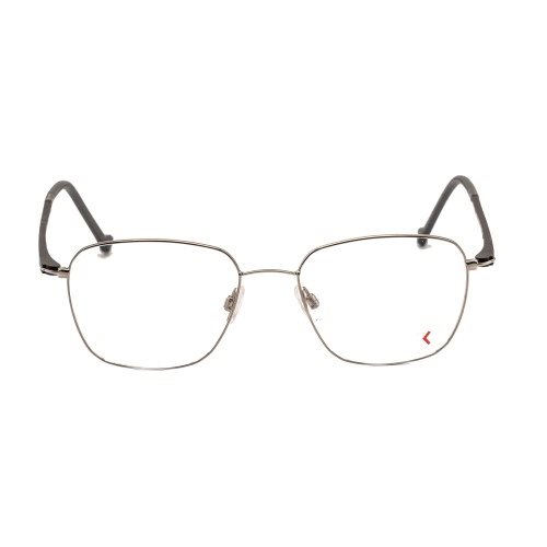 Occhiale da vista Look in metallo. Frontale di forma "geometrica" irregolare. Astine in metallo, terminali ricurvi. La montatura ha il ponte in metallo con i naselli regolabili.