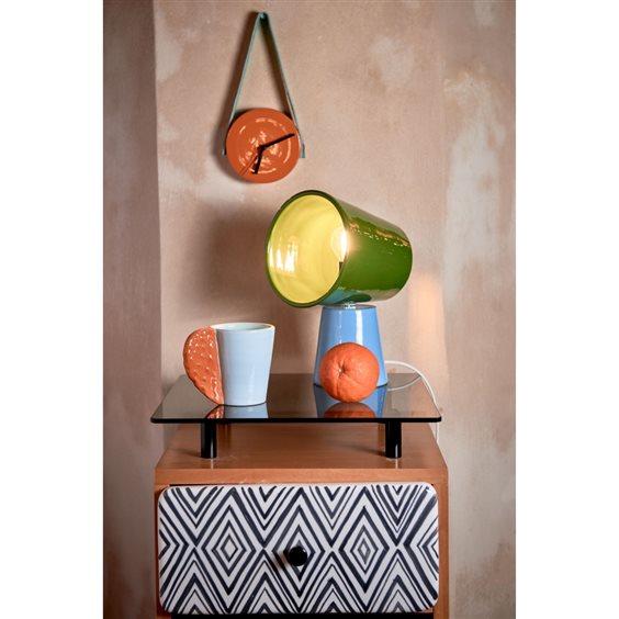 MARCO ROCCO CERAMICHE DESIGN GROTTAGLIE Orologio da parete CINTURINO piccolo, giallo lucido con cinturino in cuoio bianco. L'orologio Cinturino nasce come derivazione progettuale della lampada Emma, marcorocco infatti sviluppa il concetto di avere una parete attrezzata sopra al comodino dove poter appendere un orologio e una lampada attraverso un cinturino di cuoio e un semplice chiodo. Da questa idea nasce l'orologio cinturino e la serie della lampada Emma. L'orologio è disponibile in tre dimensioni e vari colori, opachi e lucidi.