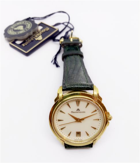 MAURICE LACROIX of Switzerland Orologio al quarzo da donna con cinturino in pelle di lucertola color verde scuro. Cassa in acciaio placcato oro giallo 10M. Quadrante bianco con datario. Impermeabile 30mt. Vetro zaffiro. Spedito con scatola e garanzia originali.