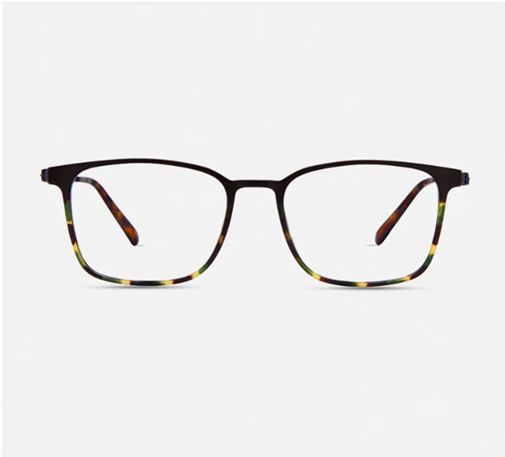 Modo Eyewear Montatura da uomo ultra leggera, flessibile e anallergica in R1000 Plastica ultraleggera e titanio. Colore frontale nero e havana con punte di verde, astetitanio blu opaco. Innovativo sistema senza viti delle astine.