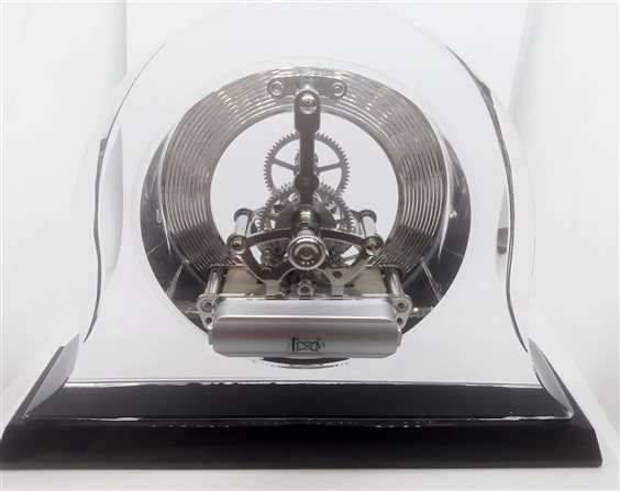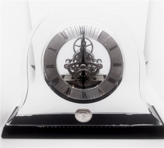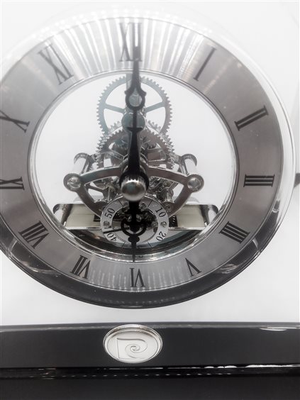 Pierre Cardin Orologio da tavolo in vetro trasparente con base in vetro nero. Movimento al quarzo a vista. Blasone del marchio in argento.