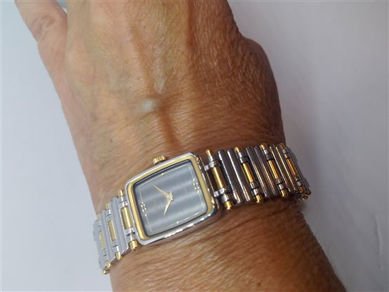 Orologio al quarzo Pulsar modernariato. Modello bracciale originalissimo completamente imperniato, acciaio e laminato oro giallo. Lunghezza 20 cm, calzata del bracciale perfetta. Vetro minerale. PGF 025
