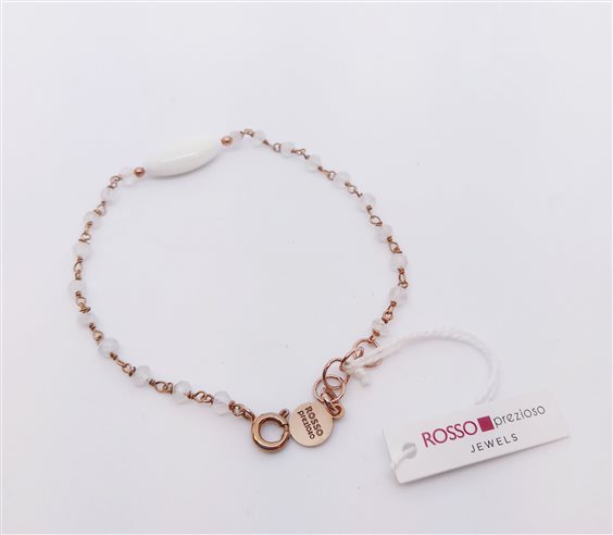 ROSSOprezioso JEWELS Bracciale in argento 925 placcata oro rosé 24kt con elemento centrale in legno laccato color bianco e sferette sfaccettate in quarzo color bianco. Chiusura con anellino a molla. La collezione ROSSOprezioso è realizzata a mano con smalti, pietre naturali,legno e placcatura oro rose’ 24kt su base palladio anti allergica o su base argento 925. I gioielli ROSSOprezioso sono pensati per donne che amano il colore e sanno giocarci con ironia ed eleganza. Tutti i gioielli ROSSOprezioso sono materici, ma leggerissimi.