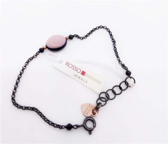 ROSSOprezioso JEWELS Bracciale della collezione BEAUTIFUL NIGHT in argento 925 brunito con ovale centrale in legno laccato color rosa e nero, piccole sfere in onice sfaccettata color nero, raccordi sferette e cuoricino finale in argento placcato oro rosé. Chiusura con anellino a molla brunito. La collezione ROSSOprezioso è realizzata a mano con smalti, pietre naturali,legno e placcatura oro rose’ 24kt su base palladio anti allergica o su base argento 925. I gioielli ROSSOprezioso sono pensati per donne che amano il colore e sanno giocarci con ironia ed eleganza. Tutti i gioielli ROSSOprezioso sono materici, ma leggerissimi. Ogni giorno è diverso, così come i tuoi outfit che cambiano a seconda dei diversi mood e occasioni. I gioielli ROSSOprezioso sono l’accessorio perfetto per chi cerca un dettaglio particolare per distinguersi
