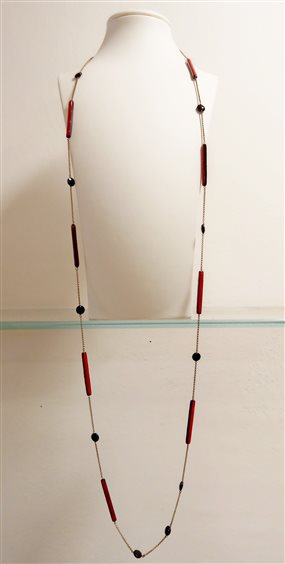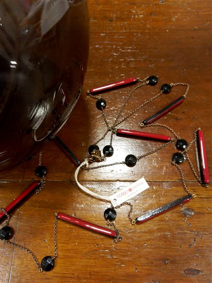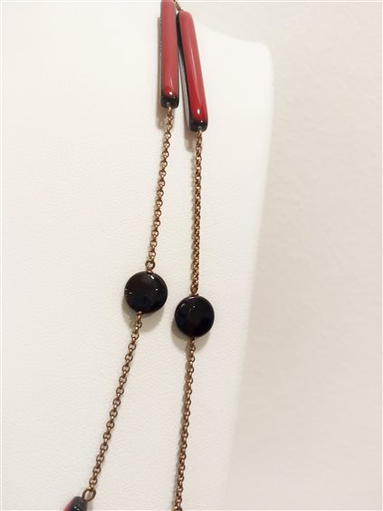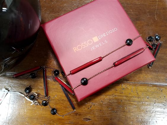 ROSSO PREZIOSO JEWELS Collana lunga JULIE Catena rolò in metallo anallergico placcato oro rosé con effetto leggermente brunito, con elementi rettangolari in legno laccato rosso e nero (4 cm)alternati a piccole drop in onice sfaccettato (diametro 1 cm). Chiusura con moschettone. La collezione ROSSOprezioso è realizzata a mano con smalti, pietre naturali,legno e placcatura oro rose’ 24kt su base palladio e anti allergica. I gioielli ROSSOprezioso sono pensati per donne che amano il colore e sanno giocarci con ironia ed eleganza. Tutti i gioielli ROSSOprezioso sono materici, ma leggerissimi. Ogni giorno è diverso, così come i tuoi outfit che cambiano a seconda dei diversi mood e occasioni. I gioielli ROSSOprezioso sono l’accessorio perfetto per chi cerca un dettaglio particolare per distinguersi Ogni pezzo è unico e speciale e alcune piccole differenze sono caratteristiche tipiche della lavorazione manuale completamente made in Italy.