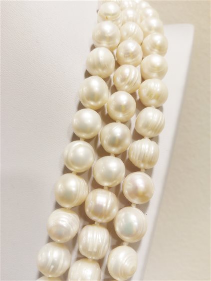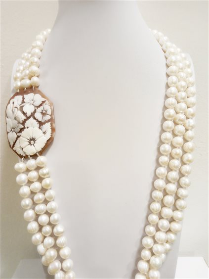 MORGANA ARGENTO Collana composta da tre fili di perle barocche di acqua dolce diametro 10 mm con medaglione cameo in conchiglia con decoro floreale che misura 6,6 cm x 5cm. Indosso senza chiusura.