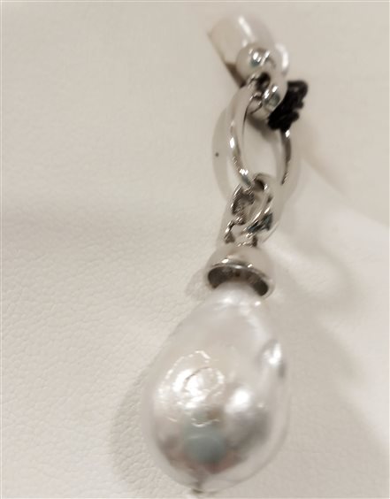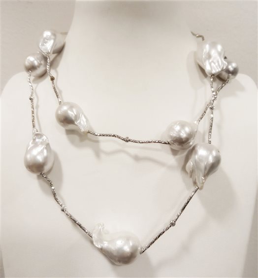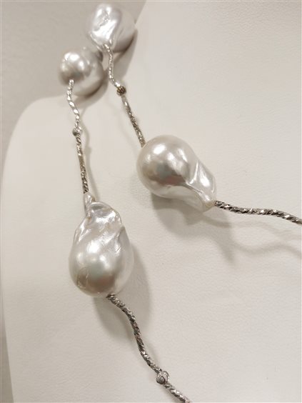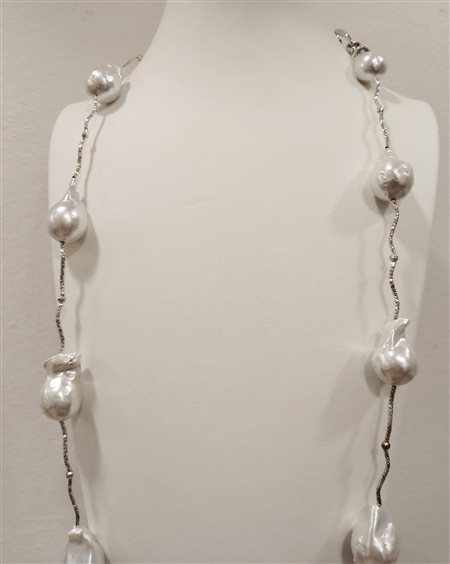 RZ Rudelli e Zambetti Collana modello Chanel in argento 925 con 13 perle barocche scaramazze bianche coltivate di acqua dolce. Catena con elementi rigidi in argento diamantato raccordati e resi mobili da una piccola sferetta diamantata. Chiusura con doppio anellino a pressione raccordato a un elemento centrale ovale che permette di agganciare a varie lunghezze. La collana è comodamente indossabile anche a due giri, la chiusura consente anche l'elegante indosso a cravatta.