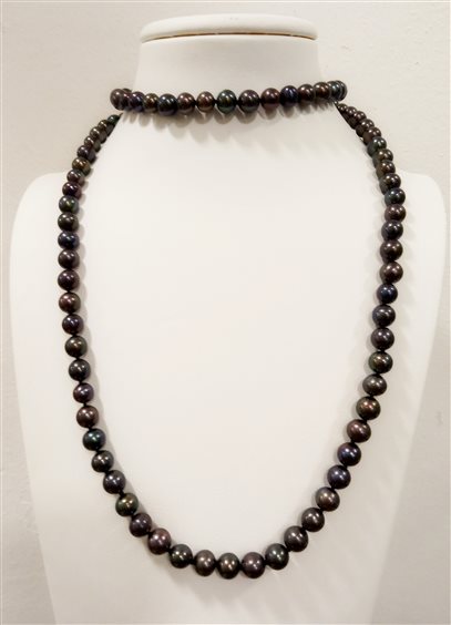 RZ Rudelli e Zambetti Filo di perle di acqua dolce nero FRESH WATER PEACOK Lunghezza totale 80 cm, indossata 40 cm, diametro delle perle 7/7.5, colore nero peacok con sfumature cangianti dal viola al verde. Senza chiusura, infilatura a nodi,indossabile a un solo giro.